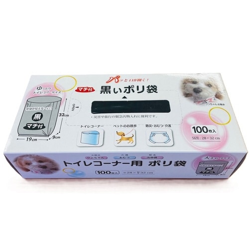 マチ付きゴミ袋100枚入りです。 中身が見えにくい黒色です。 トイレコーナーやオムツの処理、ペットのお散歩の時などに便利です。 |