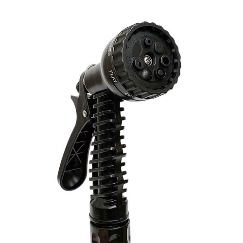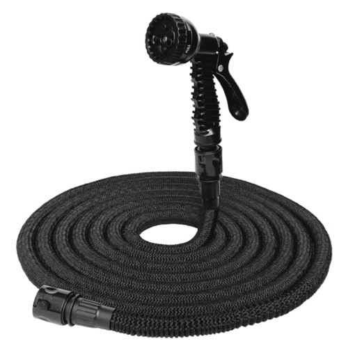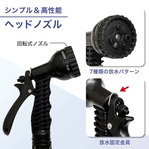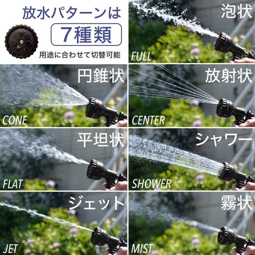 最大約3倍に伸びるホースです。 7種の放水パターンが選べる散水ノズル付きです。 軽くて摩擦に強いナイロン素材を採用しています。 放水固定金具付きで、放水状態をキープできます。 |