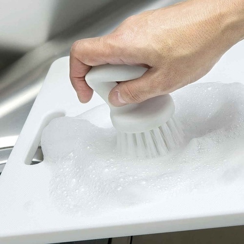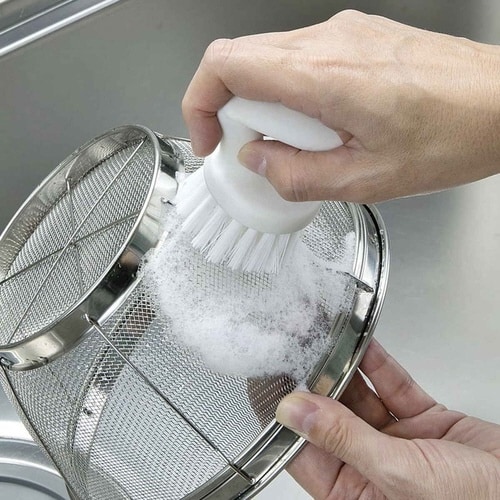 スポンジでは洗いにくいザルやまな板の網目に詰まった汚れを、コシの強いポリプロピレン毛でしっかりかき落とせます。 グリップは握りやすく力を入れやすいデザインです。 |