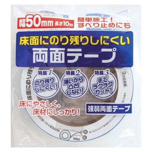 床面にのり残りしにくい両面テープです。 強弱テープで床にやさしく、しっかり付きます。 薄いのでマットが凸凹しません。 手で簡単にカットできます。 |