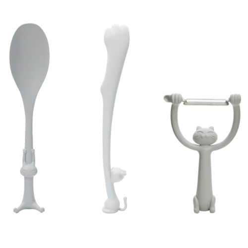 さまざまなポーズで遊ぶ猫たちをモチーフにした、マルチスプーン・トング・ピーラーのセットです。 作業台に置いた時に先端が浮き上がるので直置きにならず、調理台や卓上を汚しません。