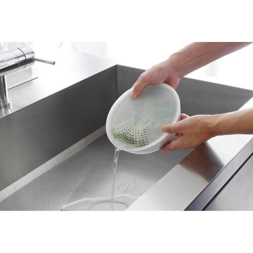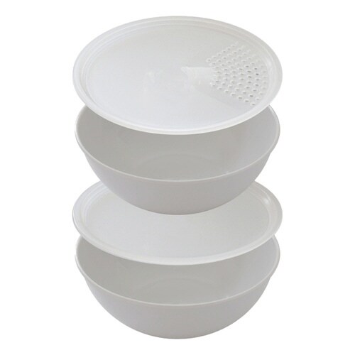 片手で使えるベストサイズの抗菌ボウルセットです。 ボウル×2個、フタ(穴あき)×1個、フタ(穴なし)×1個の4点セットです。 穴あきフタで水切りや薬味おろしができます。 |