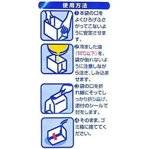 天ぷらなどの冷めた廃油を、袋内部の油吸収パッドが、スピーディーに吸収します。 1袋で600mlの油を処理でき、中袋ごと燃えるゴミとして捨てられます。 |