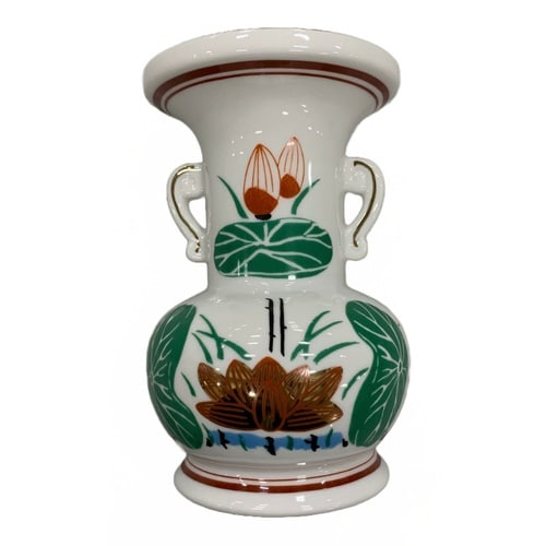 仏さまへお花をお供えするための花立、5寸サイズです。 陶磁器製です。 白地に金や赤、緑を使って蓮の花の模様が装飾されています。 |