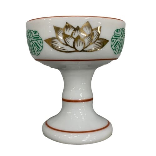 ご本尊様・ご先祖様にご飯をお供えするお道具です。 お手入れのしやすい陶磁器製です。 白地に金や赤、緑を使って蓮の花の模様が装飾されています。 炊き立てのご飯をお供えください。 |