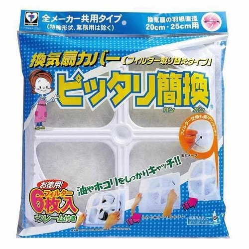 ピッタリ簡換は標準サイズの換気扇(羽根直径20から25cm)にピッタリ合う換気扇カバーです。 フィルターが6回分も入ってお得です。 フレームは熱に強く・強度の高い再生PET素材を使用しています。 |