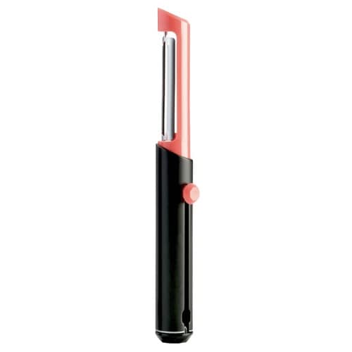 コスメのようなフォルムのI字型のピーラーです。 爪に当たりにくいので、ネイルを楽しむ女性の手にも優しいカタチです。 ボタンを押しながらスライドさせると刃を収納できます。 |