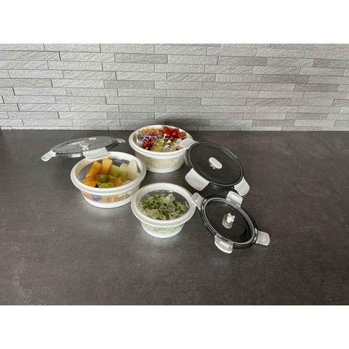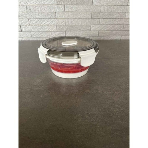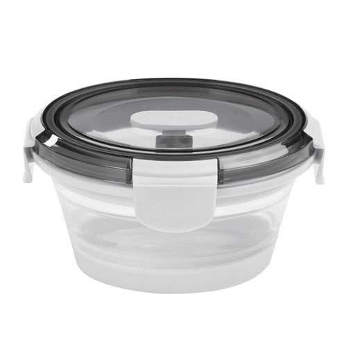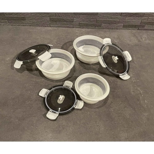 折りたためる保存容器、丸型400mlです。 透明シリコン素材で中の食材がよく見えます。 シンプルなデザインでそのまま食卓に出せます。 |