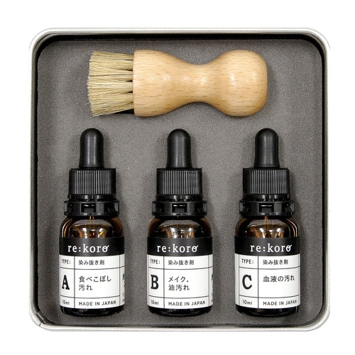 お気に入りの服にシミをつけてしまったことはありませんか? お洋服の常備薬「re:koro −りころ−シミ抜きキット」 TYPE:A 食べこぼし汚れ用 TYPE:B メイク・油汚れ用 TYPE:C |