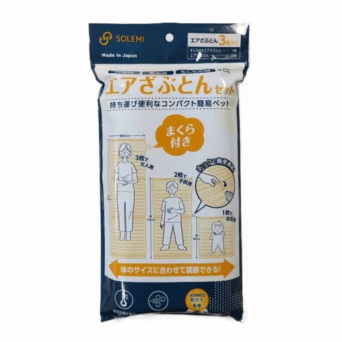ポンプやストローで膨らませるだけで使える簡易エアざぶとんです。 まくら付きエアざぶとんも付いており、ホックで連結すれば簡易ベッドにもなります。 |