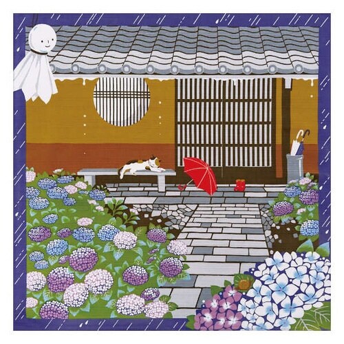 三毛猫のみけと過ごす日本の四季を描いた風呂敷シリーズの「みけの雨宿り」です。 お昼寝好きのみけは一体どんな夢を見ているのでしょう。 |