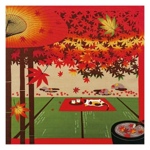 三毛猫のみけと過ごす日本の四季を描いた風呂敷シリーズの「みけと紅葉」です。 お昼寝好きのみけは一体どんな夢を見ているのでしょう。 |