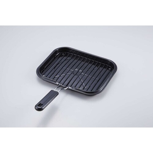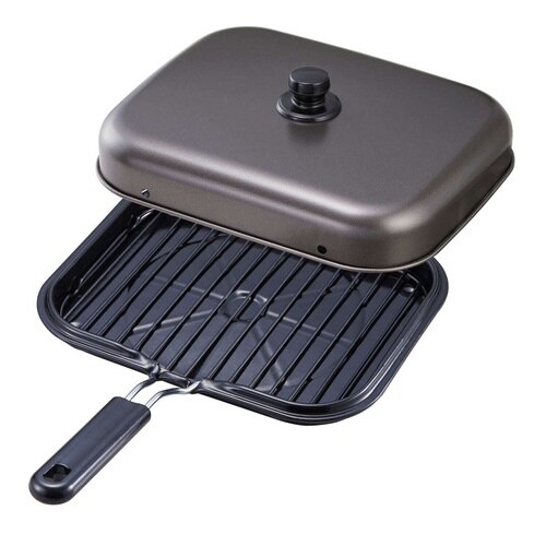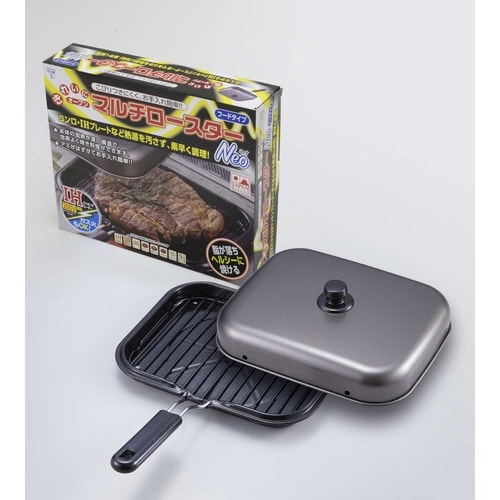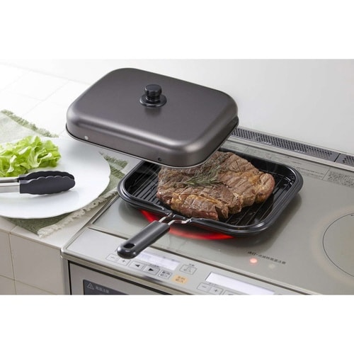 IHでも使える煙が出にくい蓋付きのマルチロースターです。 蓋をすれば、ふっくらジューシーに仕上がります。 すくいやすくこびり付きにくいストレート網が付属しています。 |