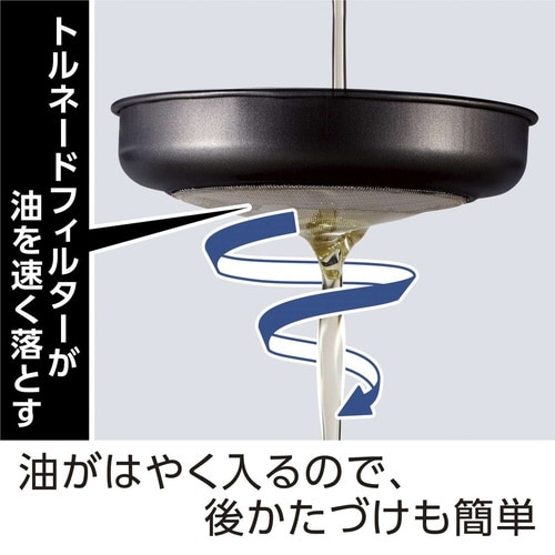 不純物を取り除いてくれるこし網には、油が早く落ちるトルネードフィルターを採用しています。蓋付きなので、油をホコリから守り、清潔に保存することができます。