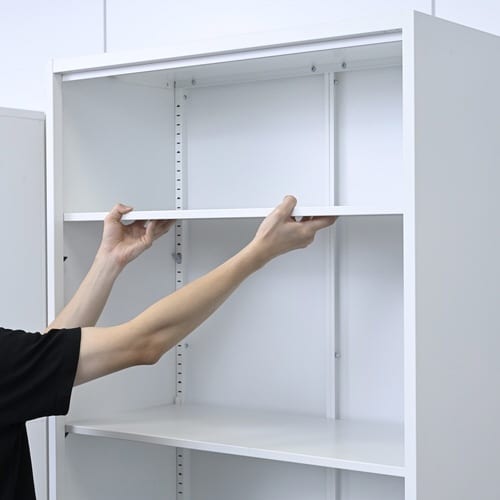 狭い場所でも寝かさずに立ったまま組立できるスチール書庫。幅800・奥行400mmのスリム構造も、各段にA4ファイルボックスが入る設計。同シリーズで横並びに連結可能。 |