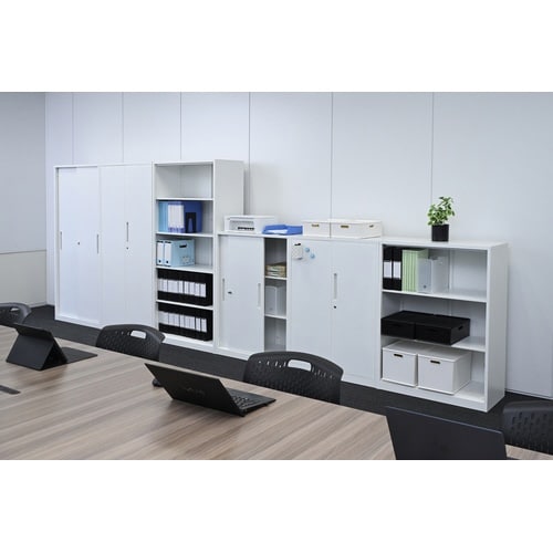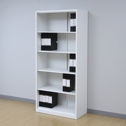 狭い場所でも寝かさずに立ったまま組立できるスチール書庫。幅800・奥行400mmのスリム構造も、各段にA4ファイルボックスが入る設計。同シリーズで横並びに連結可能。 |