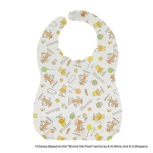 カラフルなプーさんのイラストが描かれたベビーエプロンです。 薄くてコンパクトに折りたためる使いきりタイプなので外出時に便利です |