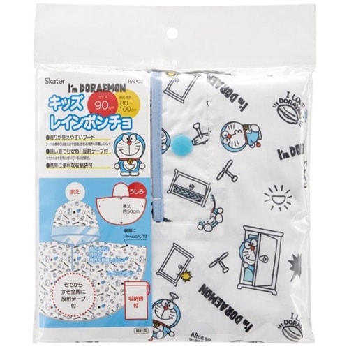 ドラえもんのレインポンチョです。 動きやすくて、脱ぎ着も簡単なので、通園時やお出かけ時に便利です。 袖からすそ全周に反射テープが付いているので、暗い道でも安心です |
