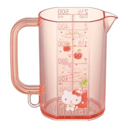 ハローキティの計量カップ(500ml)です。 平らな側面に印字されているので、目盛りが読みやすい仕様となっています。 逆さに吊るしておける「逆さ吊り」フック穴付きなので、清潔にお使いいただけます |