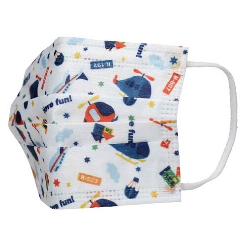 ヘリコプター柄の子供用不織布マスク10枚入りです。 防塵効果に優れた三層構造で花粉、ウィルス飛沫を99%カットします。 顔にフィットする立体プリーツ加工です |