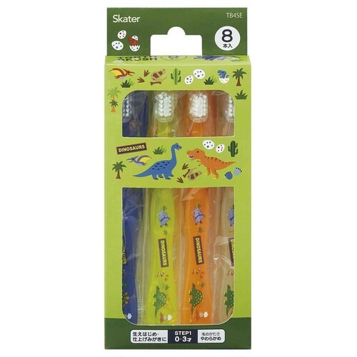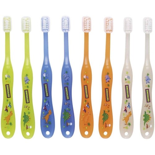 ディノサウルスの0から3才用の乳児用歯ブラシです。 ストックに便利な8本セットです。 1本ずつに歯ブラシキャップが付いています。 1本1本個包装しているので清潔に保管できます |