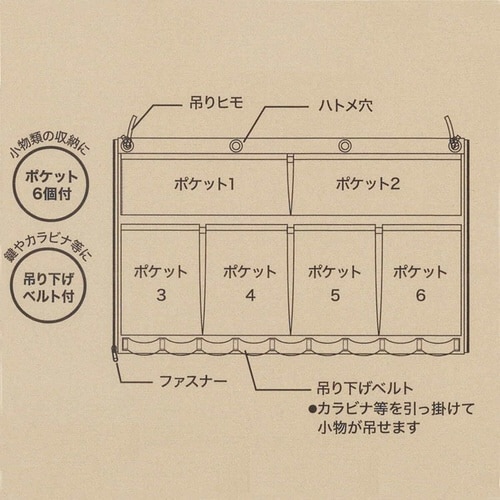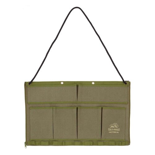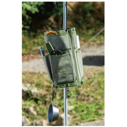 テントポール等の柱に巻き付けることができるため、アウトドアでの小物の収納に便利です。 ポケットが6個と、カラビナ等を取り付けられるベルト付きです |