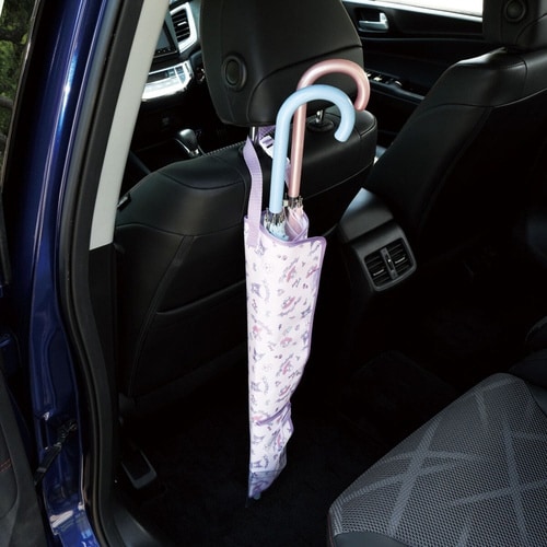 車内の濡れを防いですっきり収納できる傘カバーです。 ヘッドレストに取り付けられる留め具ベルトを使って装着できます。 出し入れが便利な面ファスナーのフルオープン式です |