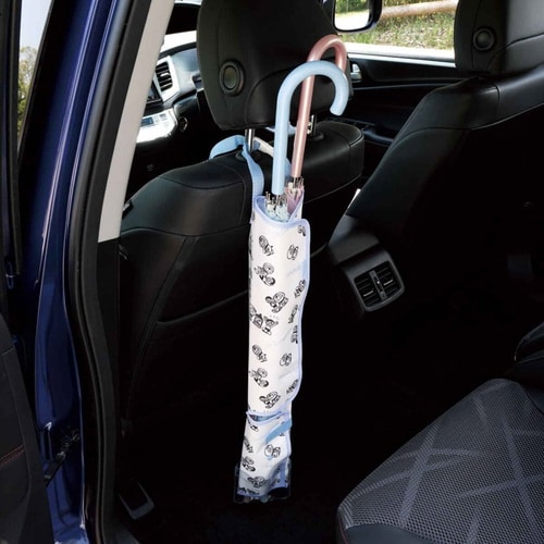 車内の濡れを防いですっきり収納できる傘カバーです。 ヘッドレストに取り付けられる留め具ベルトを使って装着できます。 出し入れが便利な面ファスナーのフルオープン式です |