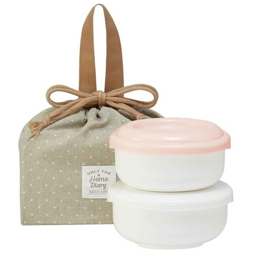 巾着袋とご飯容器、おかず容器のランチセットです。 巾着袋は持ち運びに便利な持ち手付きです。 容量はそれぞれ上段が250ml、下段が280mlで、総容量は530mlです |