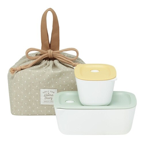 巾着袋と2サイズの容器のランチセットです。 巾着袋は持ち運びに便利な持ち手付きです。 容量はそれぞれSサイズが200ml、Mサイズが480mlで、総容量は680mlです |