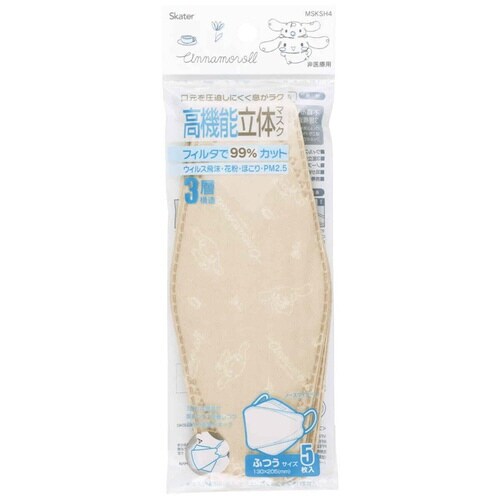 3層構造の高機能立体マスク、大人用5枚入りです。 顔の印象を明るく見せてくれるベージュをベースにワントーンのキャラクターの総柄で、シンプルにつけれます |