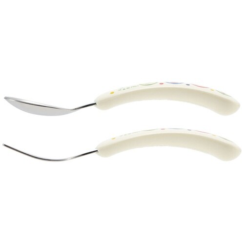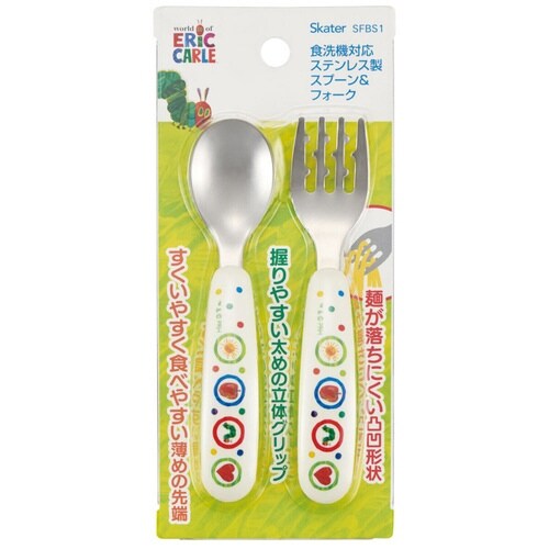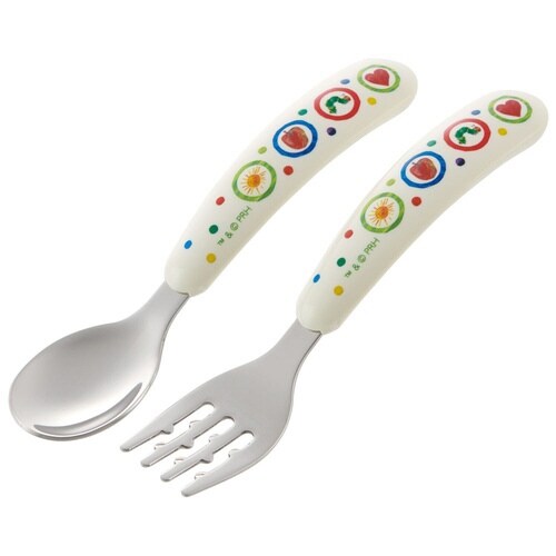 「はらぺこあおむし」のイラストがついた、小さなお子さんが使いやすいスプーン&フォークです。 小さな手でも握りやすい、太目で立体的なカーブがついた樹脂製グリップです |