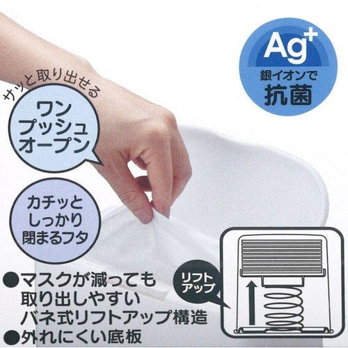 普通サイズのマスク(プリーツタイプ四角形)が約50枚収納できるマスクケースです。 蓋部分の手前を押すだけでサッと蓋が開くワンプッシュオープン式です |