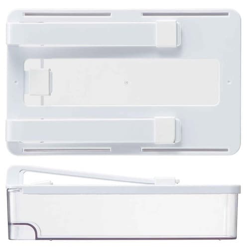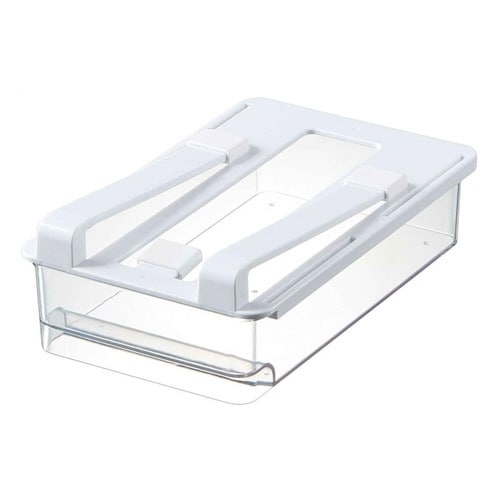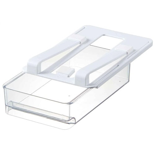 よく使う食材をすっきり収納できる冷蔵庫棚下引き出しです。 引き出し式なので奥の物も取り出しやすくなります。 棚板に取り付けるだけで簡単に設置できます |