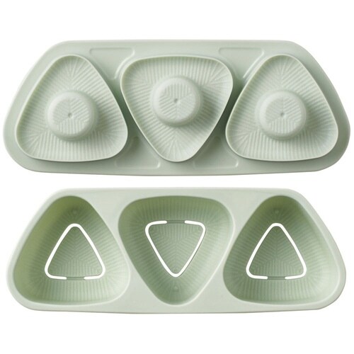 くぼみ付きのおにぎり押し型です。 食べやすいサイズを1度に3個作れます。 ご飯がくっつきにくい表面加工が施されています。 食洗器対応です。 蓋を外したら電子レンジの使用可能です |