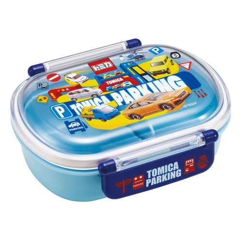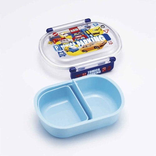 トミカの小判型タイトランチボックスです。 容量360mlで、お弁当半分に入るご飯の量は、お茶碗約0.9杯分です。 蓋以外は電子レンジ対応です。 おかずとご飯を分けられる仕切り付きです |