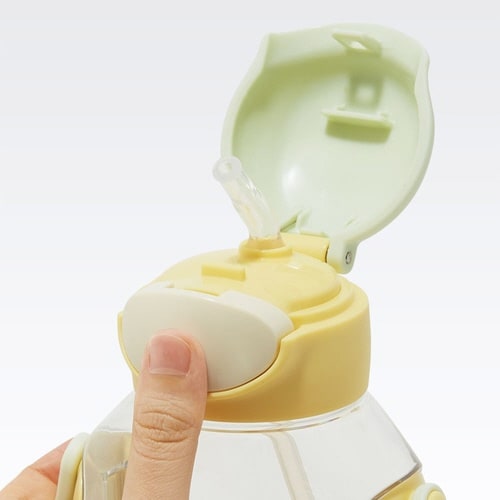 中身が見える透明ボディのストロー飲み水筒です。 本体がプラスチック製で軽く、持ち運びに便利です。 ワンプッシュオープンでシリコーン製のストローが出てきて飲みやすいです |