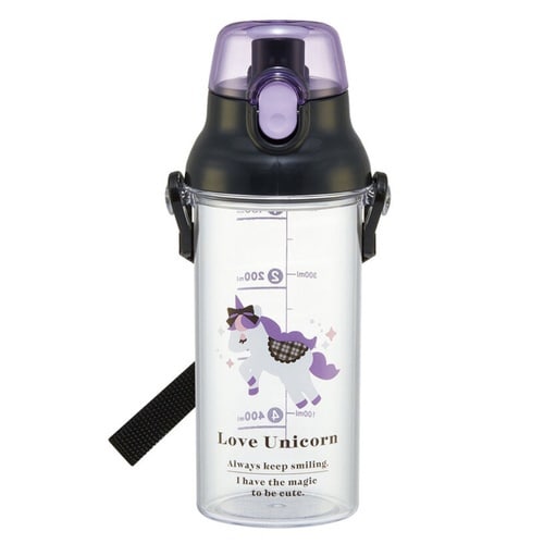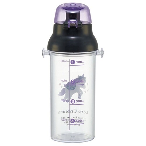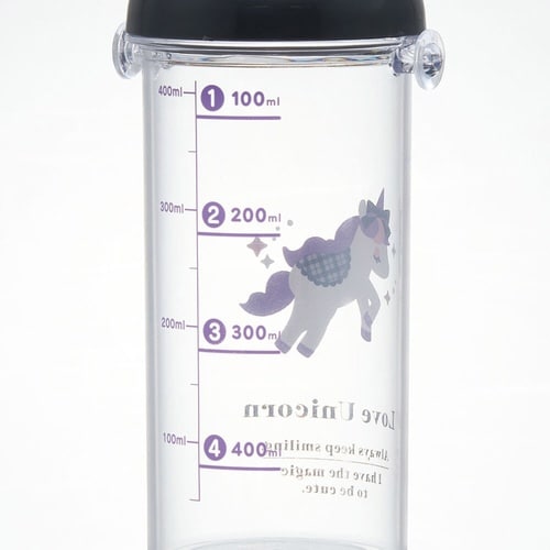 ラブユニコーンの楽しい直飲みボトルです。 1回の給水で100mlのメモリ付きです。 本体が透明のプラスチック製なので中身が見やすく分かりやすいです。 簡単に開けられるワンプッシュボトルです |