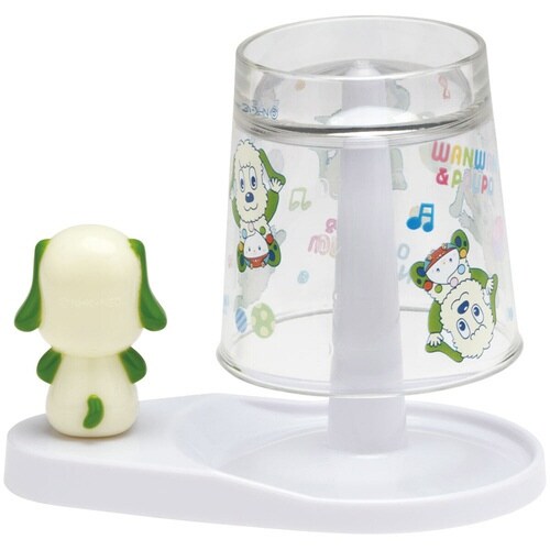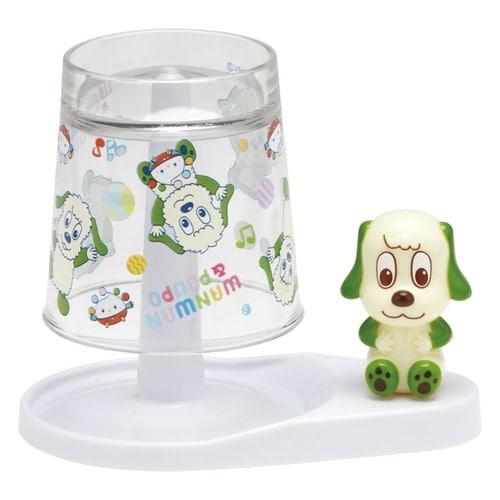 かわいいワンワンのマスコット付きのスタンドとコップです。 コップを伏せて浮かせて置けるので衛生的です。 スタンドの裏側には3か所のすべり止め脚がついています |