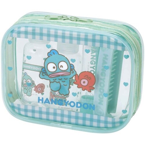 はんぎょどんのトラベルセットです。 旅行などに最適です。 ジョイント歯ブラシ・折りたたみブラシ&コーム・リキッドボトル・ポーチがセットになっています |