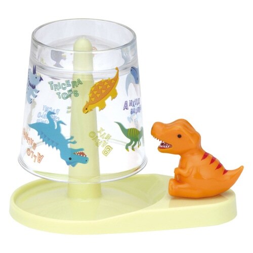 かわいいディノサウルスのマスコット付きのスタンドとコップです。 コップを伏せて浮かせて置けるので衛生的です。 スタンドの裏側には3か所のすべり止め脚がついています |