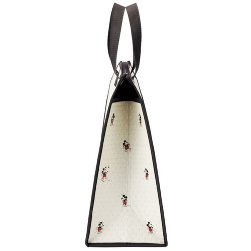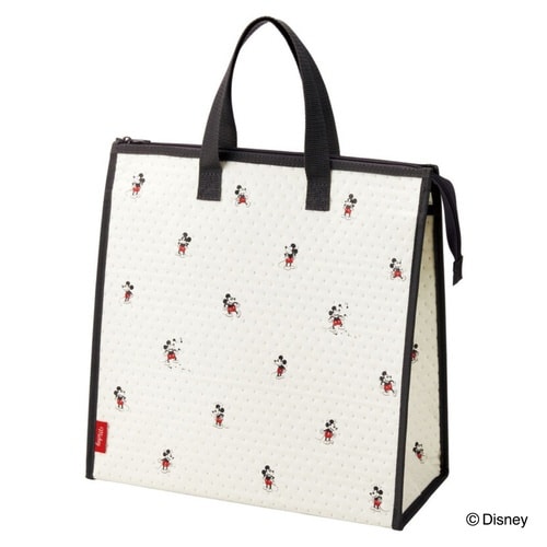 ミッキーマウスの不織布トートバッグです。 マチ幅が約17cmで大きめです。 内側には、保冷効果があるアルミ蒸着素材が使われています |