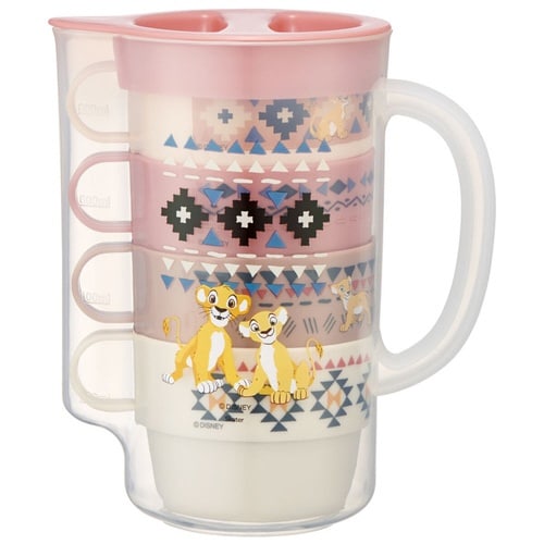 行事の時に、あると便利なケース(ピッチャー)と、持ち手付きコップ4個入りです。 シンバとナラが描かれた愛らしいデザインです。 ケースの中に重ねてコップが収納できるので持ち運びや保管に便利です |