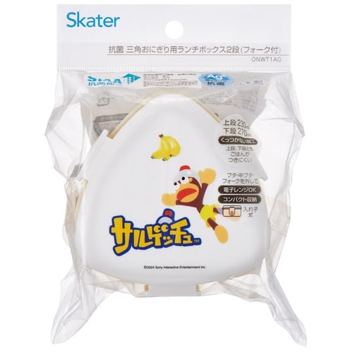 コンビニの三角おにぎりが袋のまま入るお弁当箱です。 サルゲッチュのかわいい絵柄です。 使った後はコンパクトに収納できる入れ子式です。 プラスチック製のミニフォーク付きです |