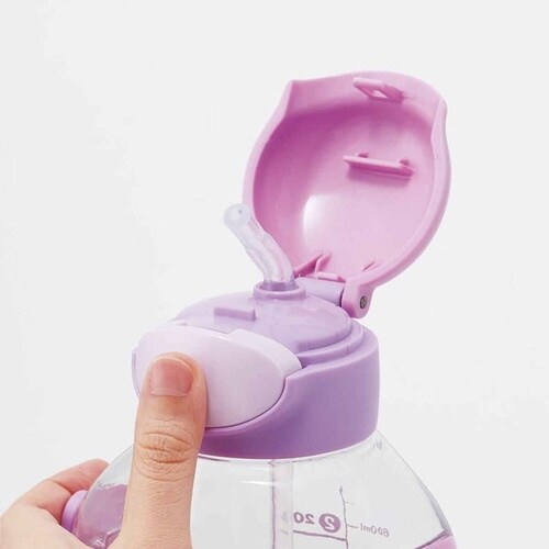 中身が見える透明ボディのストロー飲み水筒です。 本体がプラスチック製で軽く、持ち運びに便利です。 ワンプッシュオープンでシリコーン製のストローが出てきて飲みやすいです |