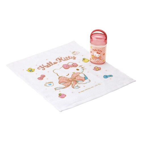 キティの抗菌加工が施されたケースとおしぼりのセットです。 ※すべての細菌の増殖を抑制するものではありません。 開けやすいように持ち手が付いたクリアな透明素材のケースです |