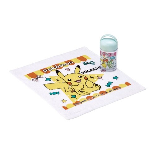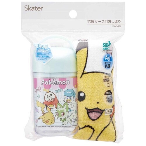 ポケモンの抗菌加工が施されたケースとおしぼりのセットです。 ※すべての細菌の増殖を抑制するものではありません。 開けやすいように持ち手が付いたクリアな透明素材のケースです |