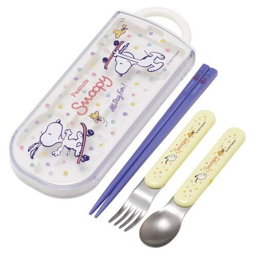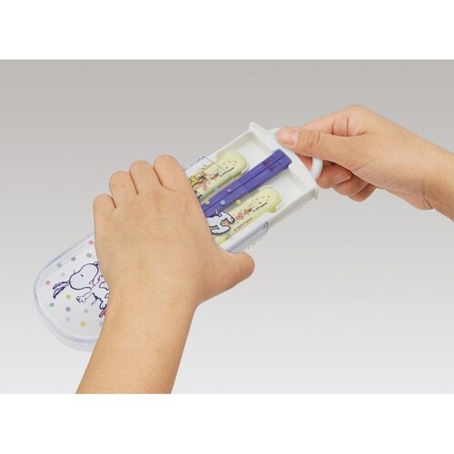 スヌーピーのお箸・フォーク・スプーン・ケースのセットです。 指を掛けてスライドできるケースなので、小さなお子様でも簡単に開閉することができます。 衝撃に強く丈夫な構造です |