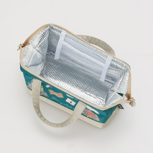 中身の出し入れがしやすい、がま口ランチバッグです。 開け口が広く、お弁当箱などの出し入れがスムーズにできます。 内側はアルミ蒸着素材で保冷効果があります。 保冷剤が入るポケット付きです |