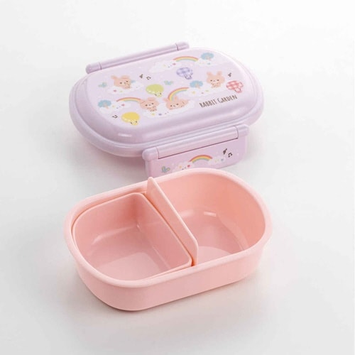 ラビットガーデンのタイトランチボックスです。 容量360mlで、お弁当半分に入るご飯の量は、お茶碗約0.9杯分です。 蓋以外は電子レンジ対応です。 おかずとご飯を分けられる仕切り付きです |